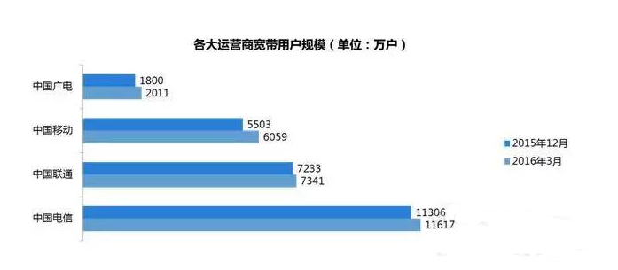 导读: 2016年注定是宽带市场发展不平静的一年。这边宽带市场的大门刚向民营企业开放不久,那边广电凭借一张“基础电信业务经营许可证”也冲杀进来。原来的老牌运营商中,中国移动的宽带发展意识觉醒,迅猛的发展势头搅得联通和电信心神不宁。