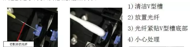 V型槽的清洁方法如上图所示,可以先使用棉棒或是切割好的光纤对V型槽进行仔细的清洁,注意在清洁的时候一定要打强光,有必要的时候还可以使用放大镜来观察V型槽底部的情况。还需要注意的是V型槽的材质为陶瓷不要使用坚硬的东西进行打磨会弄伤V槽。